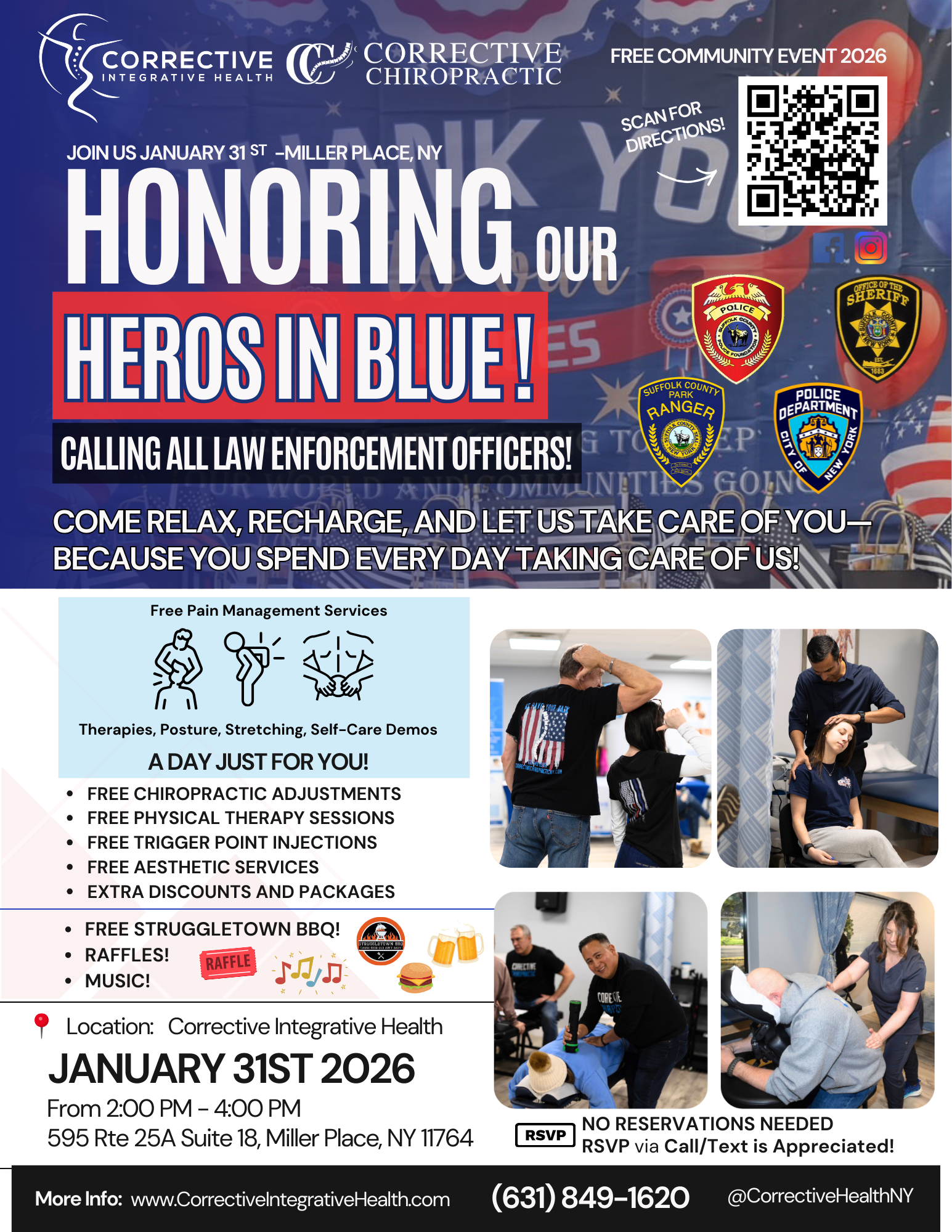 Corrective Integrative Health and Corrective Chiropractic are proud to host Honoring Our Heroes in Blue, a free community event dedicated to the brave men and women of law enforcement. We invite all law enforcement officers to join us for a day of relaxation, rejuvenation, and well-deserved care as a token of our gratitude for your daily service and sacrifice. – Read More